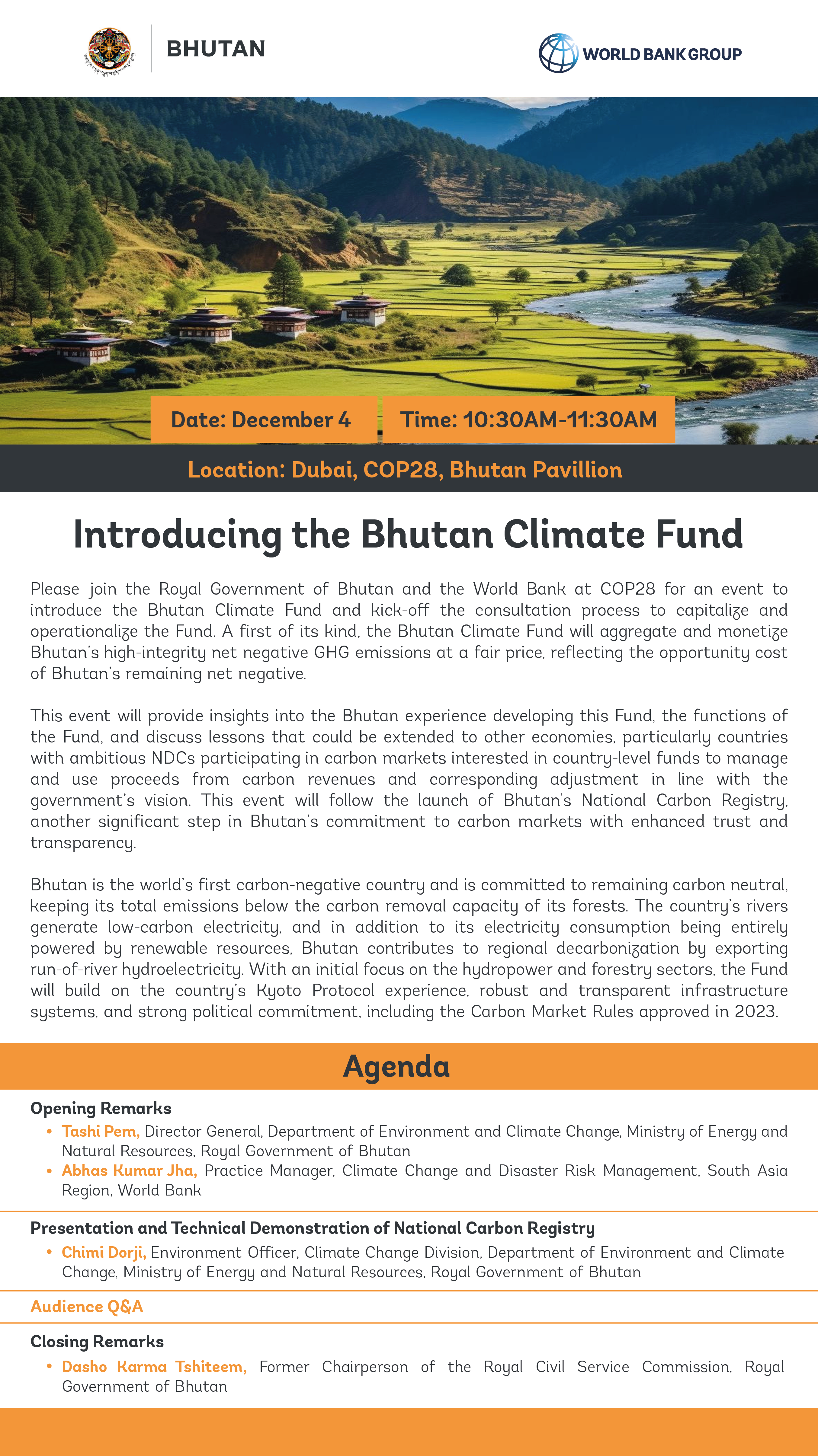 The Royal Government of Bhutan and the World Bank is launching Bhutan Climate Fund at COP28. A first of its kind, the Bhutan Climate Fund will aggregate and monetize Bhutan's high-integrity net negative GHG emissions at a fair price, reflecting the opportunity cost of Bhutan's remaining net negative.